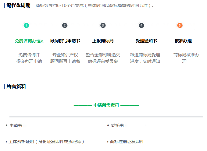 • 申请材料及办理流程(一)准备申请书件1.应提交的申请书件为:(1)《商标续展注册申请书》(2) 申请人经盖章或者签字确认的身份证明文件复印件(如企业的营业执照副本、自然人的身份证/港澳居民居住证/台湾...